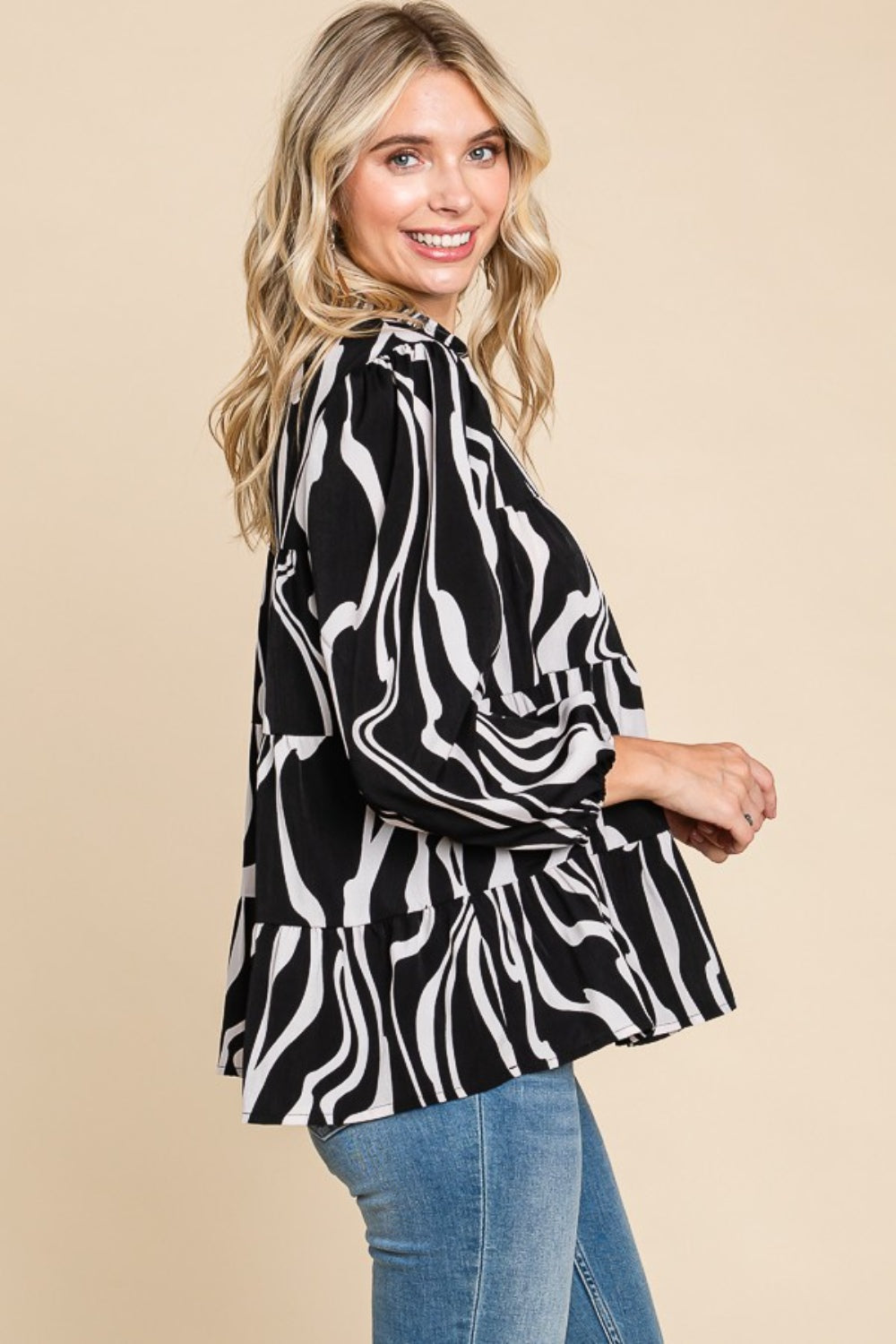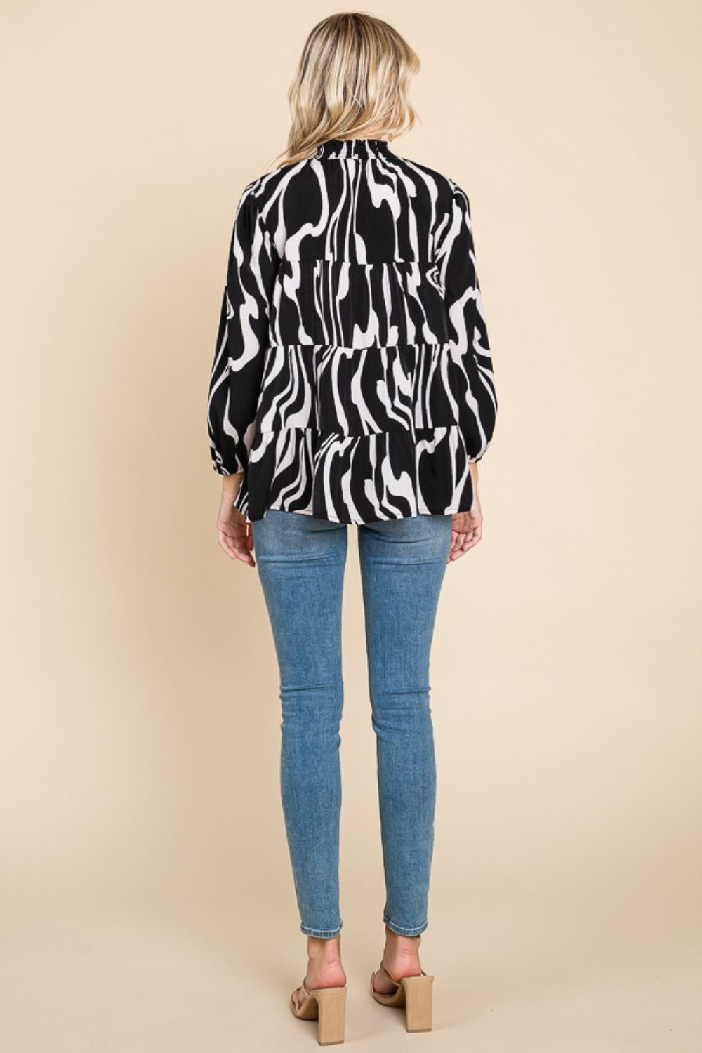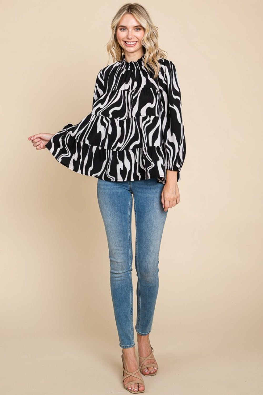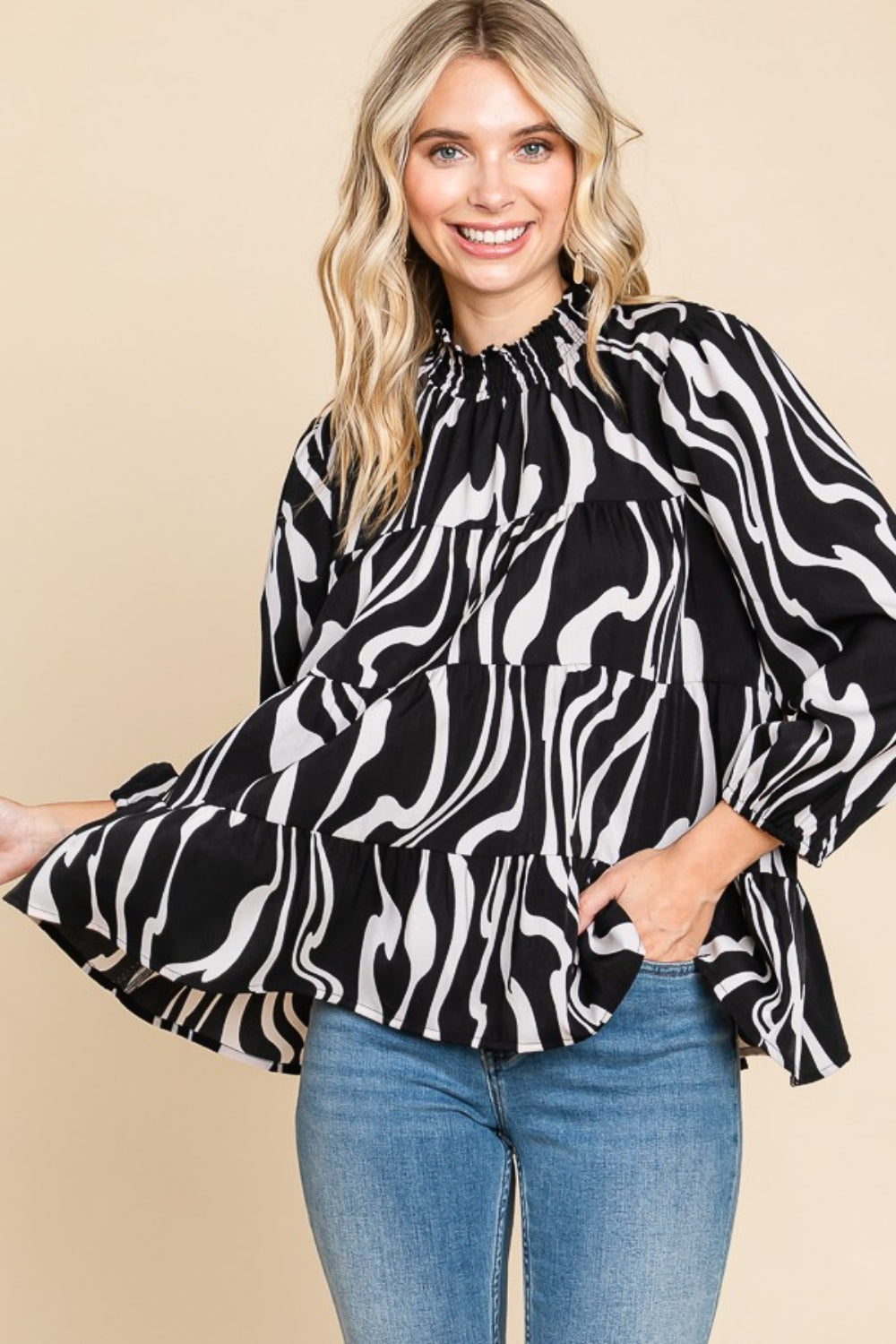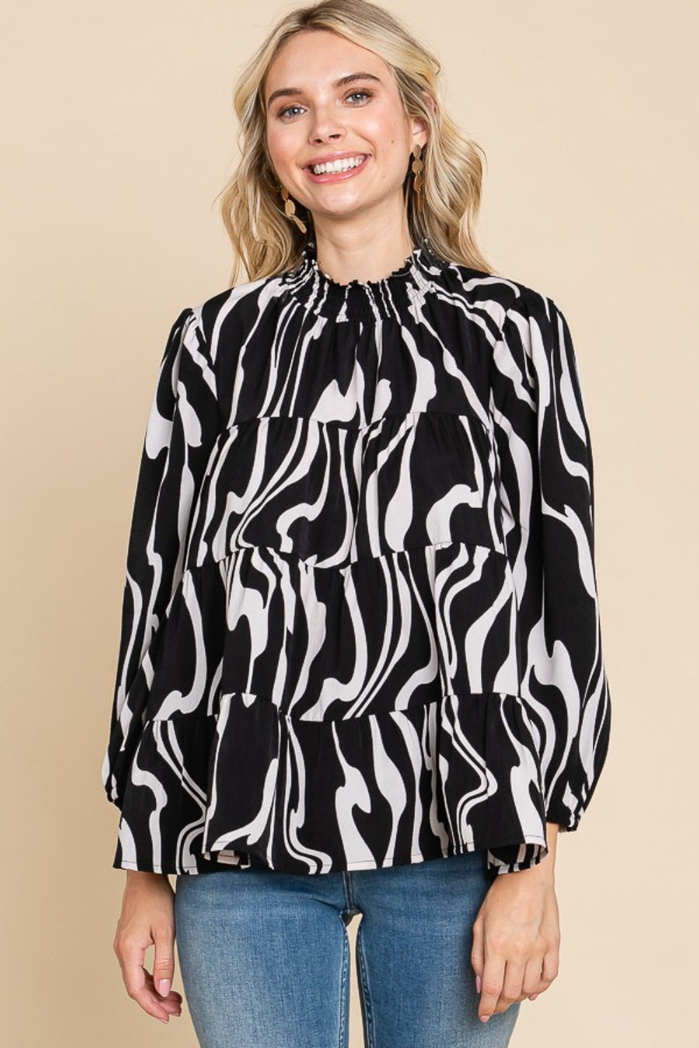 This Printed Smock Neck Tiered Blouse features a flowing silhouette with a smocked neckline and tiered design. The vibrant print adds a pop of color to any outfit, while the smocked neckline adds a touch of femininity. With its loose fit and airy fabric, this blouse is both comfortable and stylish. Pair it with jeans for a casual look or dress it up with a skirt for a more formal occasion. The tiered design adds a trendy and unique element to this blouse, making it a standout piece in any wardrobe. Whether you're going to work or out for a night on the town, this blouse is sure to turn heads.