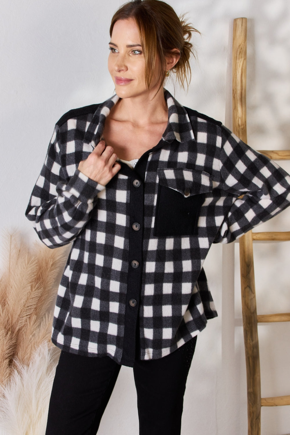 Plaid Button Up Jacket is a timeless and classic outerwear piece that features a stylish plaid pattern and a button-up front. With its versatile design and warm fabric, this jacket is perfect for layering over various outfits to add a touch of sophistication and style. Whether you wear it with jeans for a casual look or pair it with a dress for a more polished ensemble, this plaid button-up jacket is a fashionable choice for chilly days.