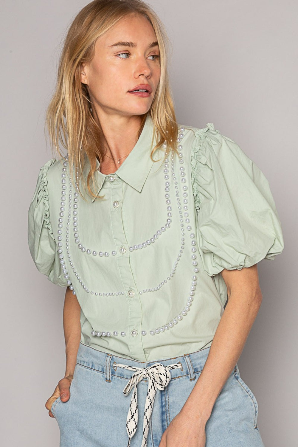 Add a touch of elegance to your wardrobe with this pearl detail button up puff sleeve shirt. The delicate pearls adorn the buttons, creating a sophisticated and stylish look. The puff sleeves add a touch of romantic flair to the classic button-up shirt design. Perfect for adding a feminine touch to any outfit, this shirt is a versatile and chic addition to your collection.