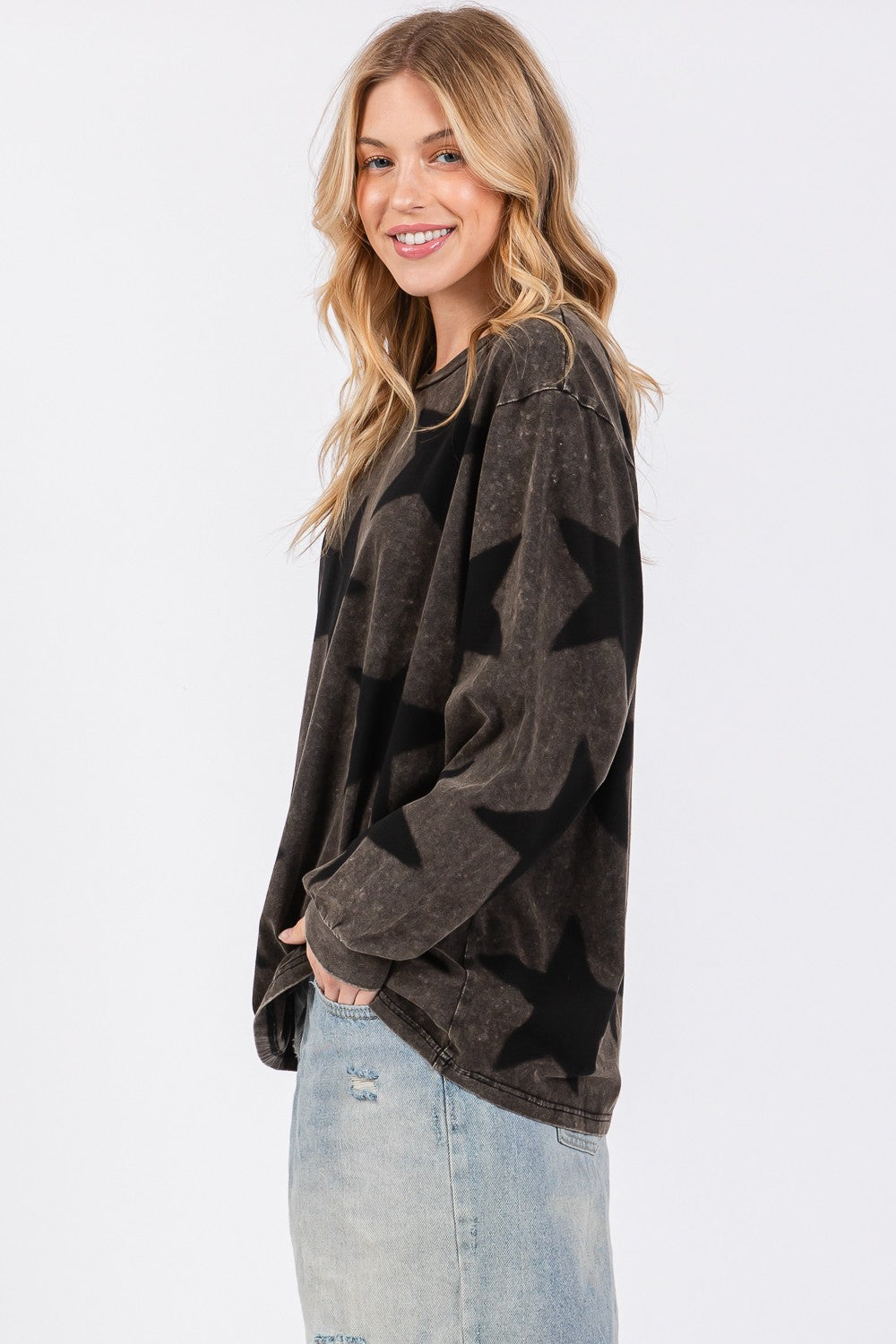 The mineral wash star pattern T-shirt is a trendy and eye-catching addition to your wardrobe. Featuring a unique mineral wash finish and star pattern design, this shirt offers a stylish and edgy look. The combination of the washed effect and the star pattern creates a cool and distinctive aesthetic. Perfect for adding a touch of flair to your casual outfits, this T-shirt is versatile for various occasions. Embrace your individual style with this fashionable and statement-making mineral wash star pattern T-shirt for a bold and standout look.